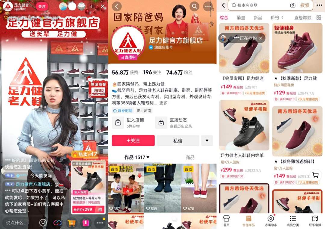 根据热浪数据,足力健的品牌矩阵号有21个。其中 @足力健官方旗舰店 每月坚持带货四十场,场均直播时长在10h以上,足力健官方旗舰店销量达到117.9万,店铺内仅有三款不同的产品,销量最好的为129元的老年健步鞋,销量达49.7万。足力健的线上整体销售额近2亿。