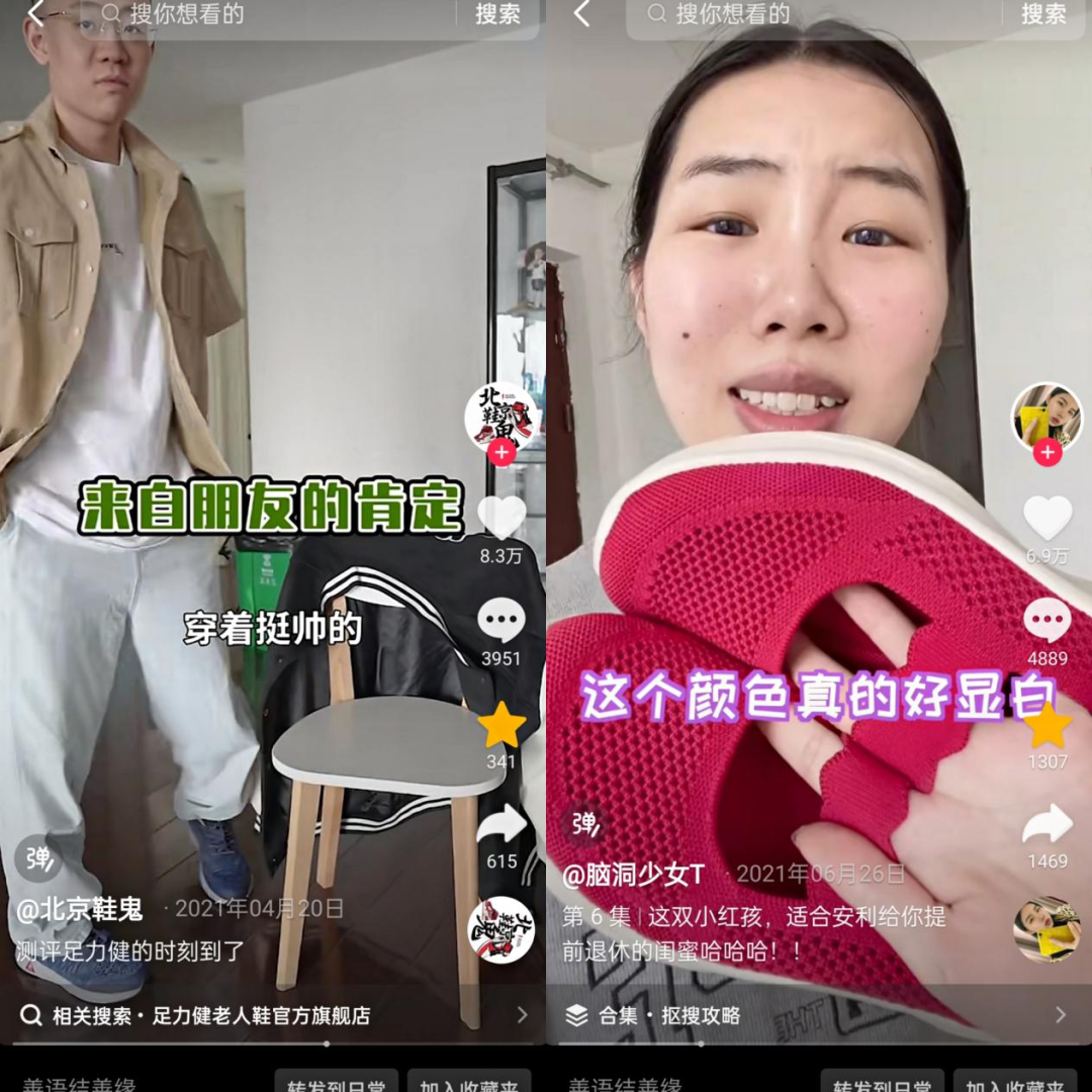 随着回力、飞跃、鸿星尔克等一众“国潮”鞋的兴起,2021年时足力健在抖音上被称为“NIKE平替”“老年版AJ”被@MARK马克潮流严选 @脑洞少女T @北京鞋鬼 等达人推荐。