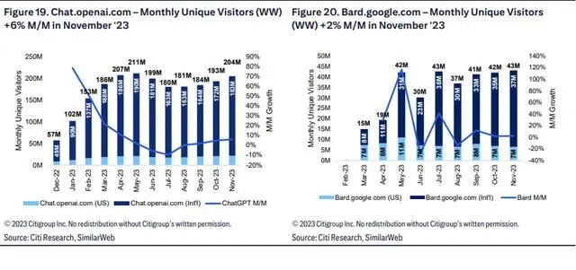 Google的Bard:Bard最近更新到Google最新的基础模型Gemini上,目前已在230多个国家和地区上线,并且据SimilarWeb的数据,月活用户数量已达约4300万。我们认为Bard是谷歌构建更加交互式搜索体验(和网络)战略的关键组成部分,并预计在2024年会有更多特定垂直领域的应用案例,比如旅游、医疗和教育等。虽然目前ChatGPT市场份额比Bard更大,但我们认为Bard和SGE(搜索生成式体验)可至少能够维持当前的搜索市场份额。
