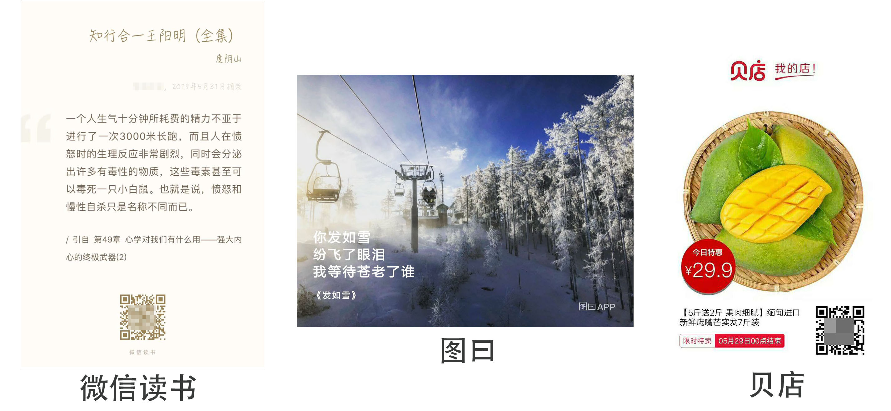 读图时代,分享图片取得的效益往往不会太差,除了要保持视觉信息的完整性、设计上要抓人眼球外,还可以植入二维码链接、App名称、Solgan、LOGO一类的元素。本质上二维码形式也只是H5页面的延伸,只是改变了展现形态,用户的进入方式由点击打开链接,变为扫码进入内容页。