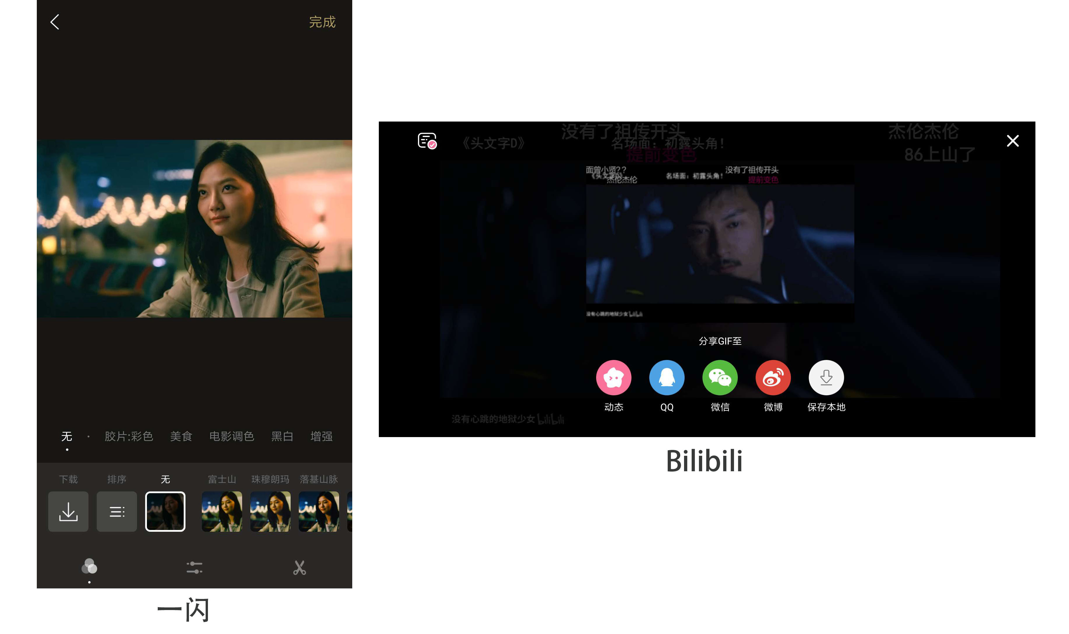 - 一闪一类的VLOG剪辑App甚至给动图附带滤镜、编辑、尺寸缩放等功能,用户可以自行美化动图再进行分享。