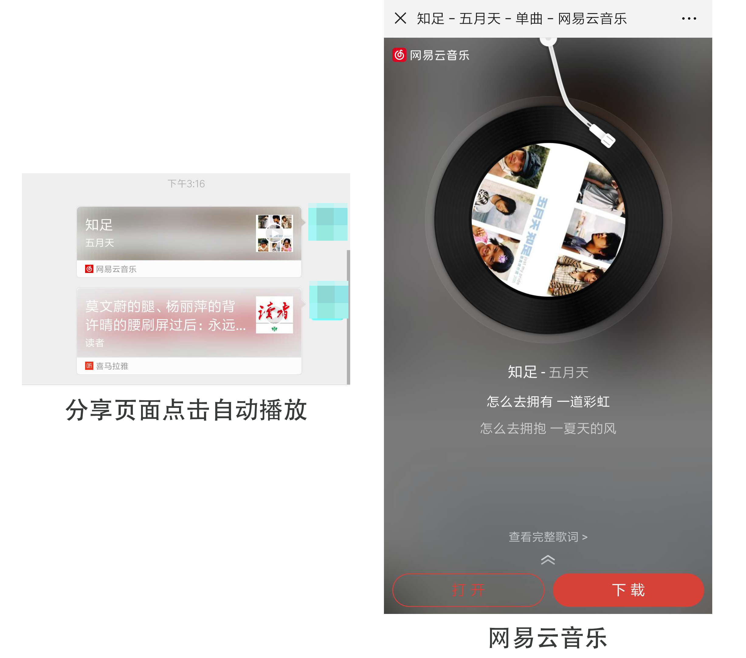 分享音频到微信中可以直接点击播放,但网页交互体验上并不算很好,无法挂起页面继续收听,也无法查看完整歌词等,完整功能要打开App后才能实现。展现形式上,音频的分享页面与普通的网页分享相比狭长一些,分享封面上也有播放CD的图标,这些特征方便用户辨认类型。