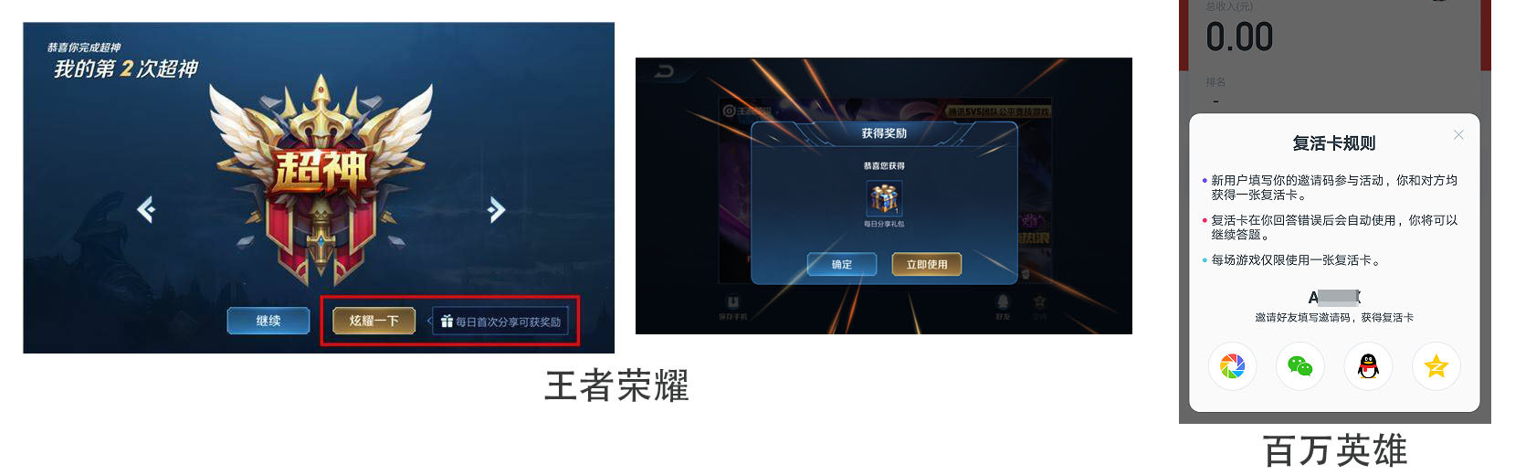 - 要抓准用户心态,把握展示分享功能的时机,如完成任务或产品体验后的分享提示;排行榜、荣誉勋章、成就的查看环节植入分享功能等