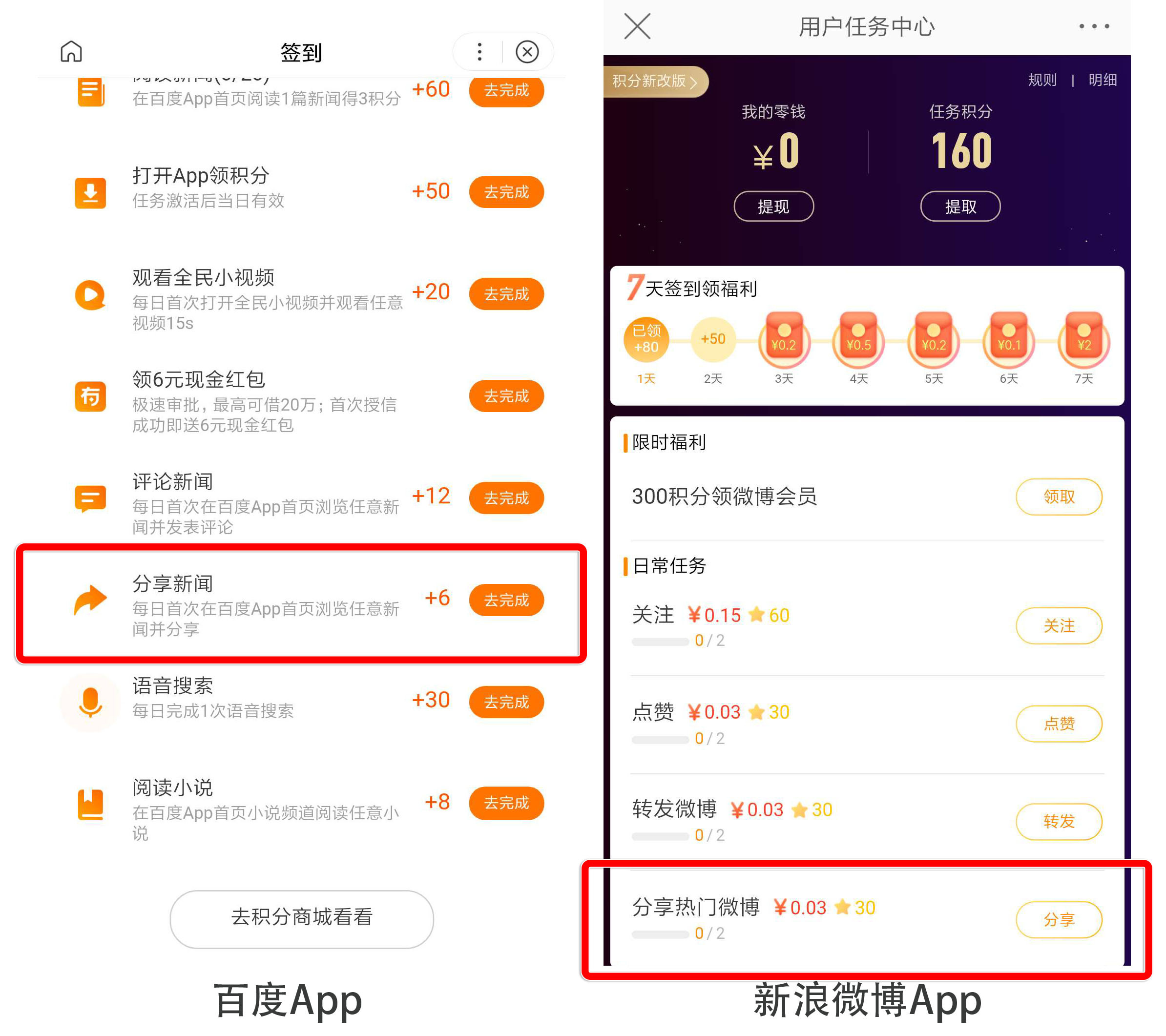 与上一条不同的是,这类用户分享的出发点不在于获得更好的产品体验,而在于现金奖励可提现,是阅读类、资讯类产品常用的获客手段,分享要求一般为产品的某项功能或内容。但目前分享即可获得奖励(现金或积分)的App已经很少了,只发现百度和微博App还有分享即可获得奖励的机制,为了防止薅羊毛行为,这种形式需要从设备唯一性、提现门槛等方面做限制。