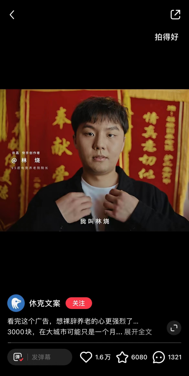 洞察到年轻人焦虑的生活状态,快手联合养老院拍了一支本地化广告,让不少年轻人种草了许昌。
