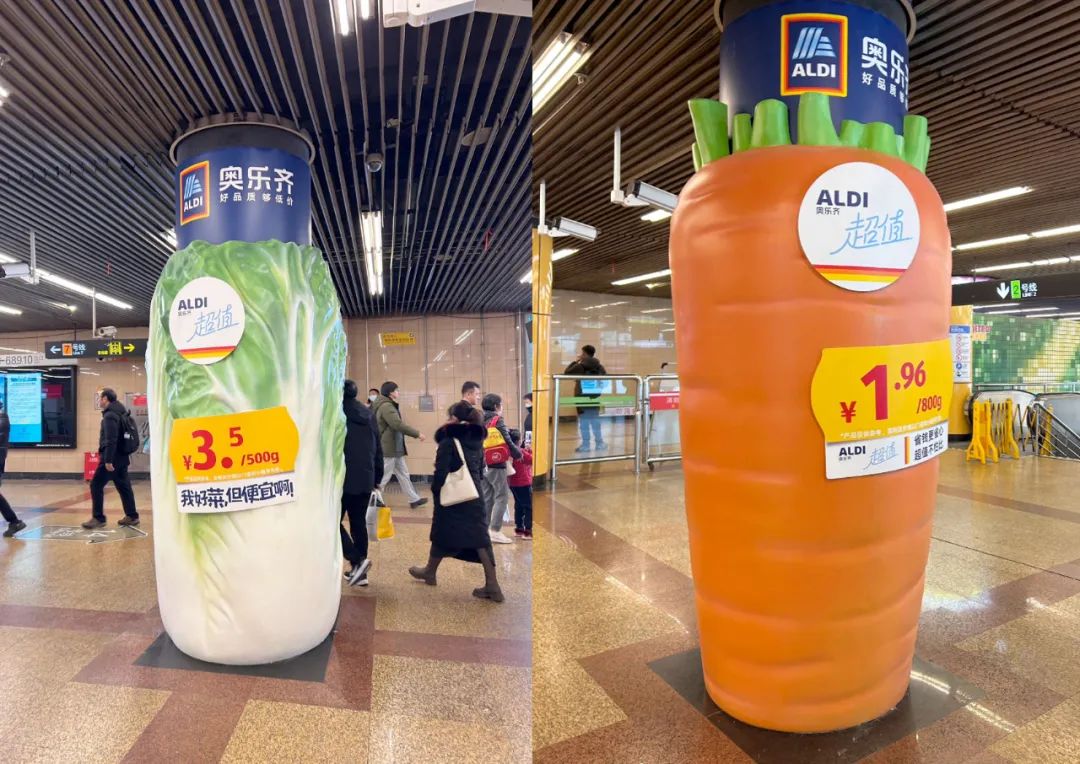 平价超市奥乐齐,在上海静安寺地铁里,投放了巨型蔬菜、牛奶、胡萝卜;