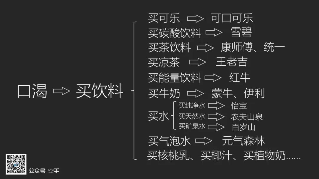 先决定喝气泡水,再选择元气森林;先决定买水,当然还可以进一步细分,比如买天然水就是农夫山泉,买纯净水就是怡宝,买矿泉水就考虑百岁山。