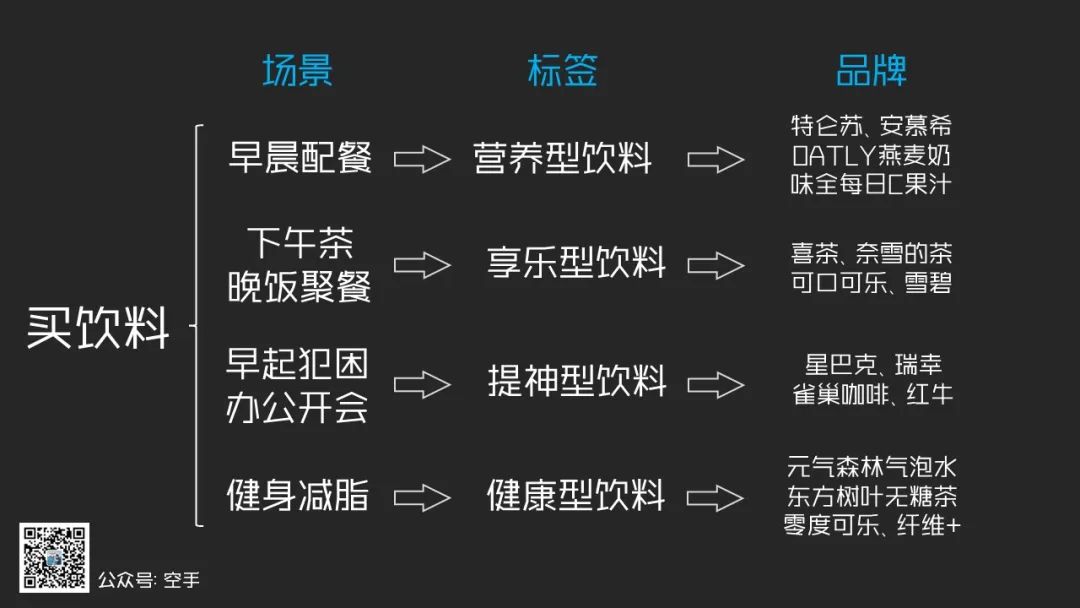 其做法是创造更多消费场景,激活并创造新的用户需求;然后通过给品牌贴标签的方式,建立品牌与场景的关联,影响用户决策。
