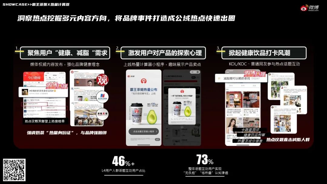 微博通过数据分析,发现消费者在自律场景下最为关注的点是“奶茶热量”。于是借势权威媒体,为霸王茶姬打造了#你喝的奶茶有身份证吗 这一热点话题,引发用户关注和讨论,强化奶茶与“热量身份证”之间的关联。