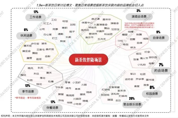 首先,微博团队对1.9万条日常讨论新茶饮的原创博文进行了分析,从中识别出了9大类茶饮消费场景,包括工作、休闲、季节、伴餐、聚会娱乐、校园、约会、自律、演唱会等。