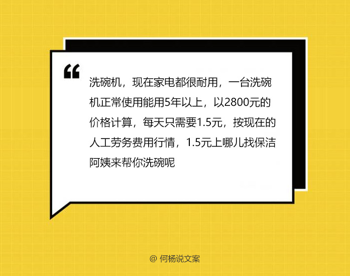 - 最后别忘了再刺激一下用户,记住只有对比才会造成更大的心理落差。将我们算出的成本和用户之前某个替代品付出的成本做对比,比如:洗碗机的替代品可以是请阿姨,所以最后的问句是亮点——1.5元上哪儿找保洁阿姨来帮你洗碗呢?用户突然有种对价格释怀的感觉,手不自然的按下下单按钮。