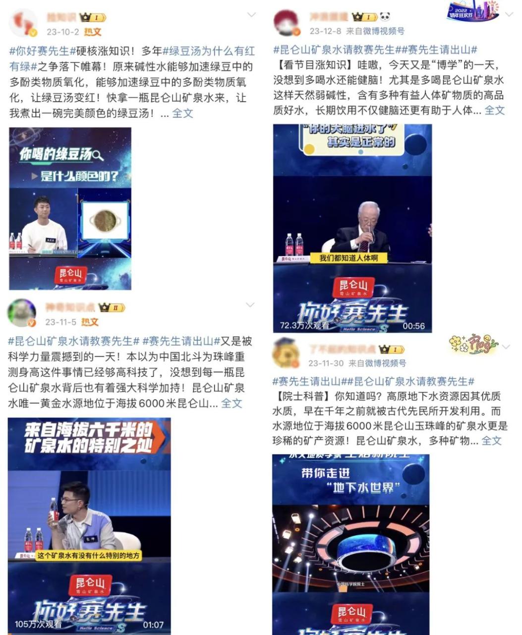 再加上社交平台上#绿豆汤为什么有红有绿#、#昆仑山矿泉水请教赛先生#、#赛先生请出山#等曝光超过4.6亿的互动话题,更多观众也在潜移默化中感知到产品的珍稀品质,提升了产品的大众认知度和好感度。