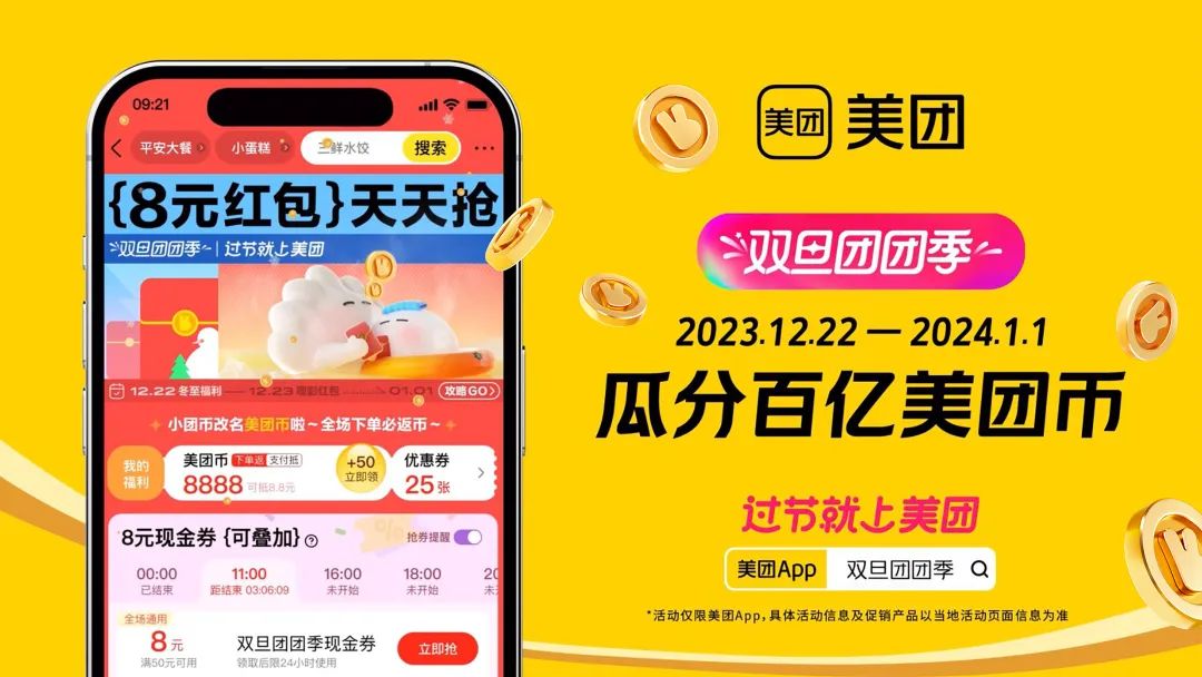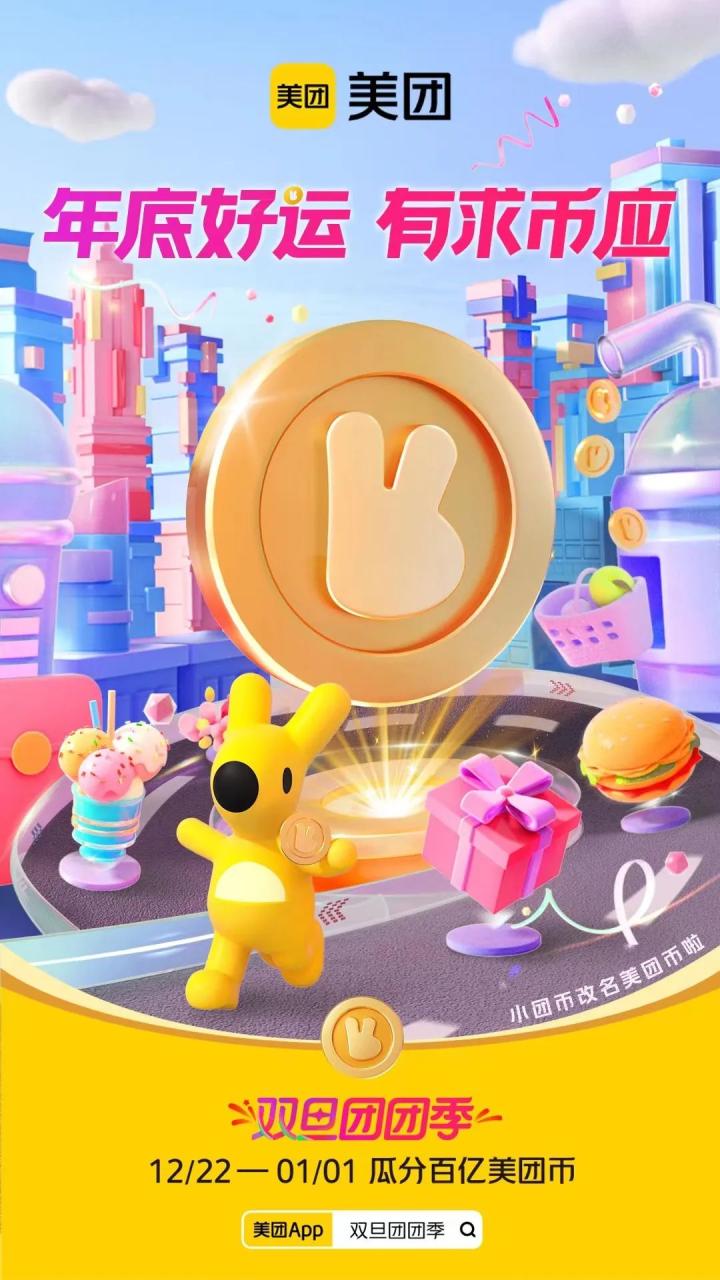 如果说美团的双旦TVC通过创意的“升维”从节日消费场景中获得了“品牌懂我”的情感认同;那么TVC中“美团币”的视觉形象表达同样强化了品牌与大众之间的价值纽带,让“瓜分百亿美团币”的核心福利持续吸引更多消费者参与到美团的年末双旦大促中,并形成更加清晰的认知、深刻的视觉记忆。