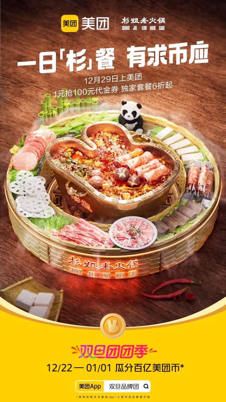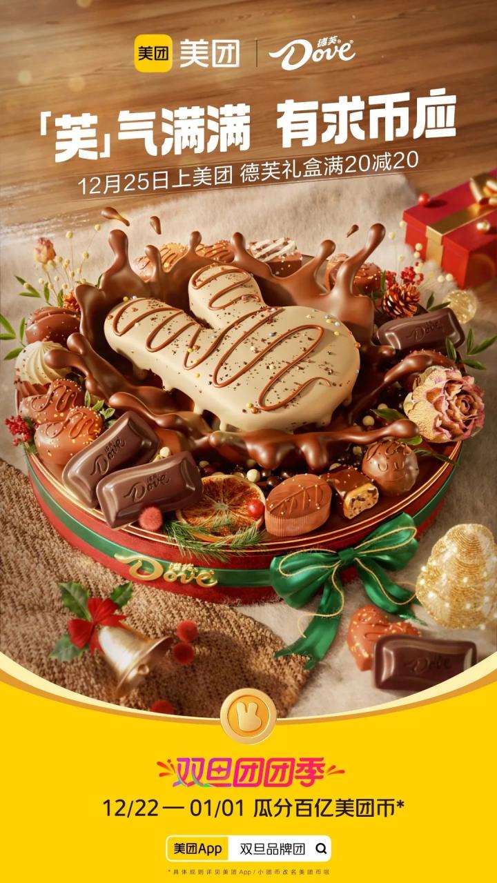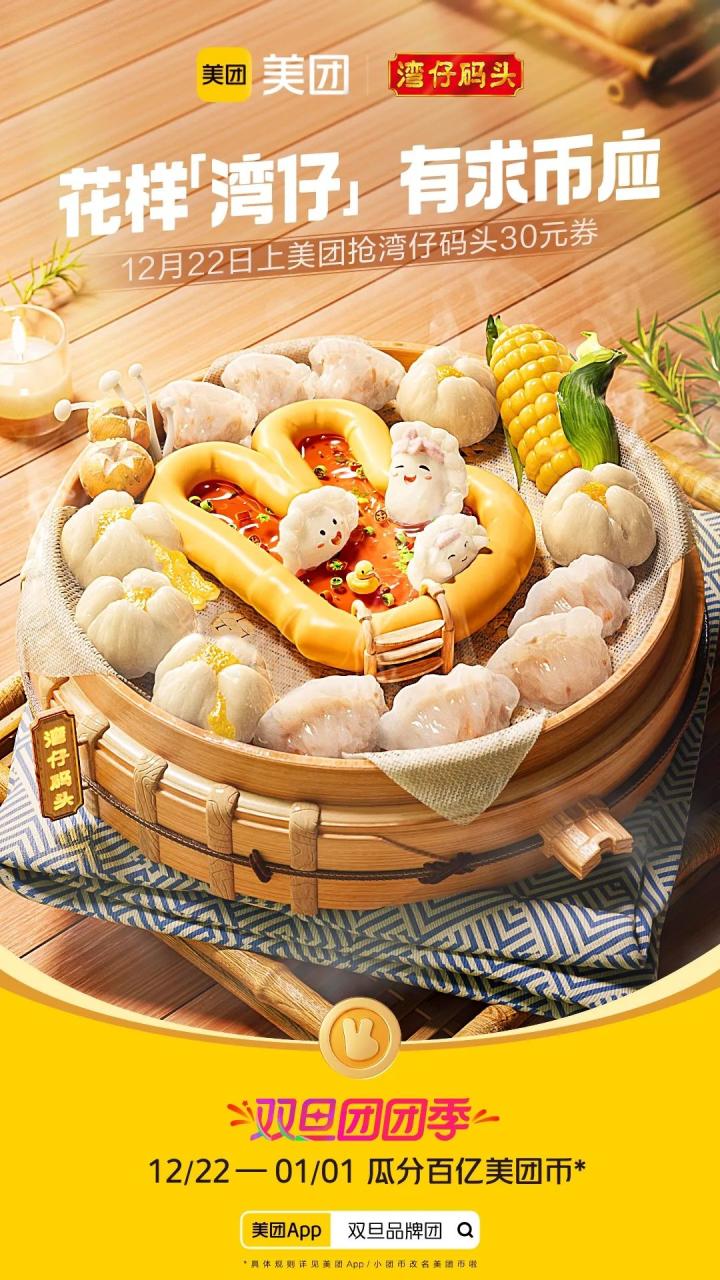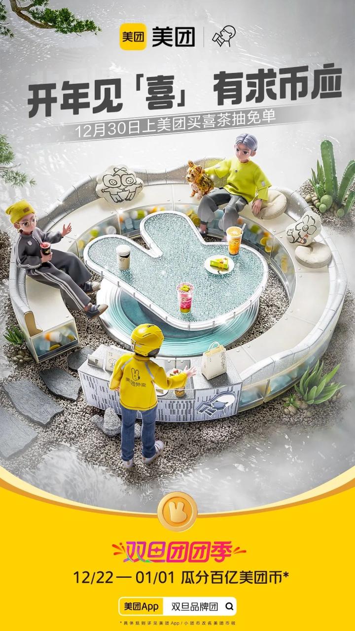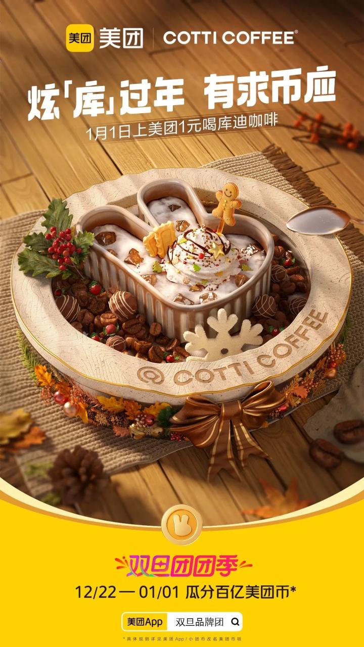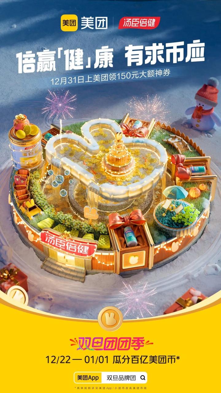 高级的营销不是建立庞大的营销网络,而是利用品牌的超级符号,把无形的营销网络铺建到大众视野和心里。此次双旦团团季,美团集结了酒店、餐饮、健康等领域的超多品牌,以“美团币”这一超级符号为创意点,联合出品了美团币X品牌的主题海报,共同营造出双旦团团季的购物氛围,并将“上美团有求币应”的福利辐射到最大面,实现用户参与的乘法效应。