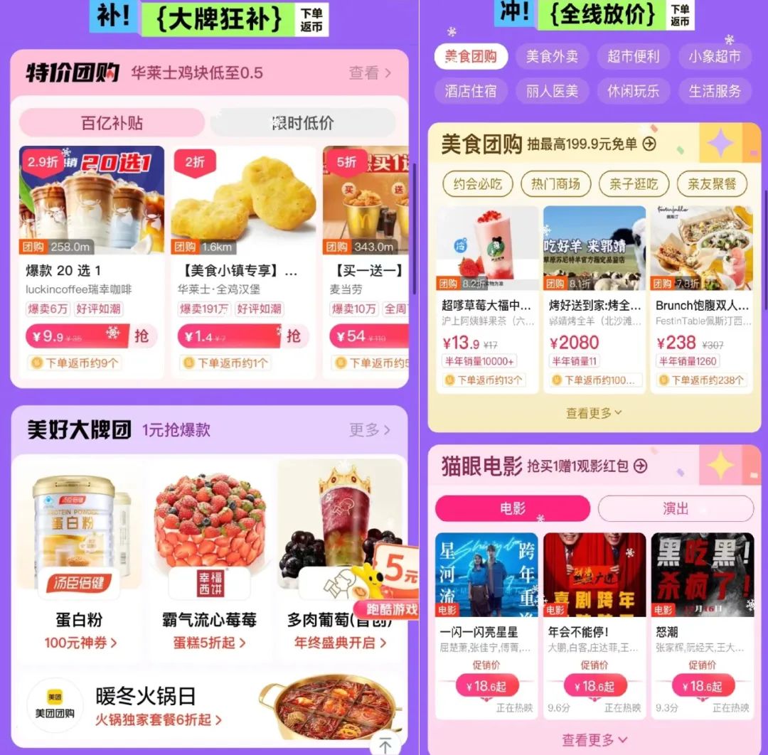 对于用户而言,不止是双旦,在接下来的春节、情人节等重要节点,都是消费决策的高峰期,而美团“团团季”从首页搜索、首页猜喜、支付页面、红包卡券页面等用户动线捕捉高精准多元化消费需求,拉动节日消费刚需;同时美团整合全业务线,既有【大牌狂补】单品,又有【全线放价】个性化精准推荐,在丰富的购买场景中持续加码“过节就上美团”的心智影响。