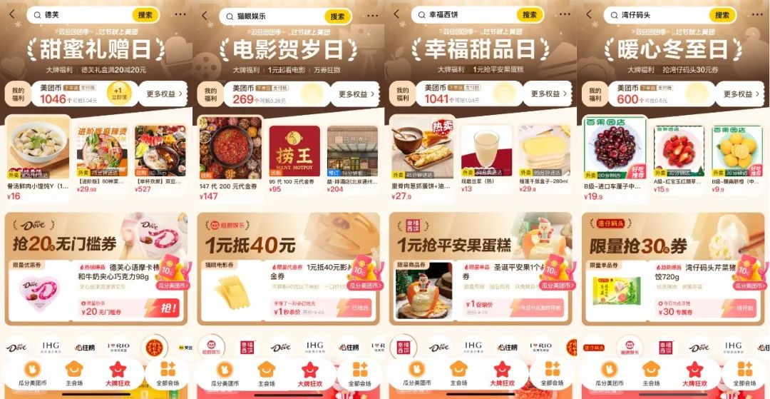 正如在年末双旦的营销节点,各大平台信息叠加导致消费者脱敏的现状下,美团深度植入消费场景中,以美团币作为视觉窗口,围绕冬至、圣诞、元旦打造「三波次」特色供给,提升团团季营销活动声量的同时,也进一步深化了“过节就上美团”的用户心智。