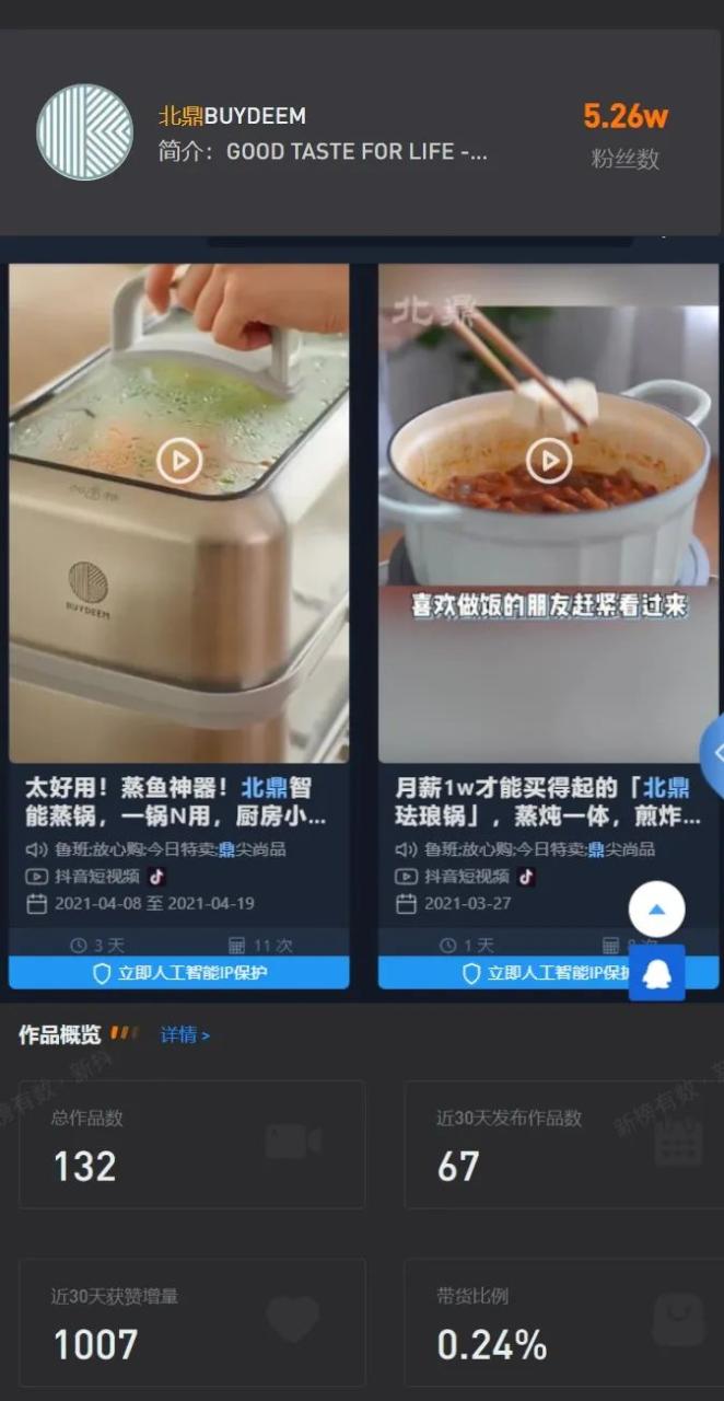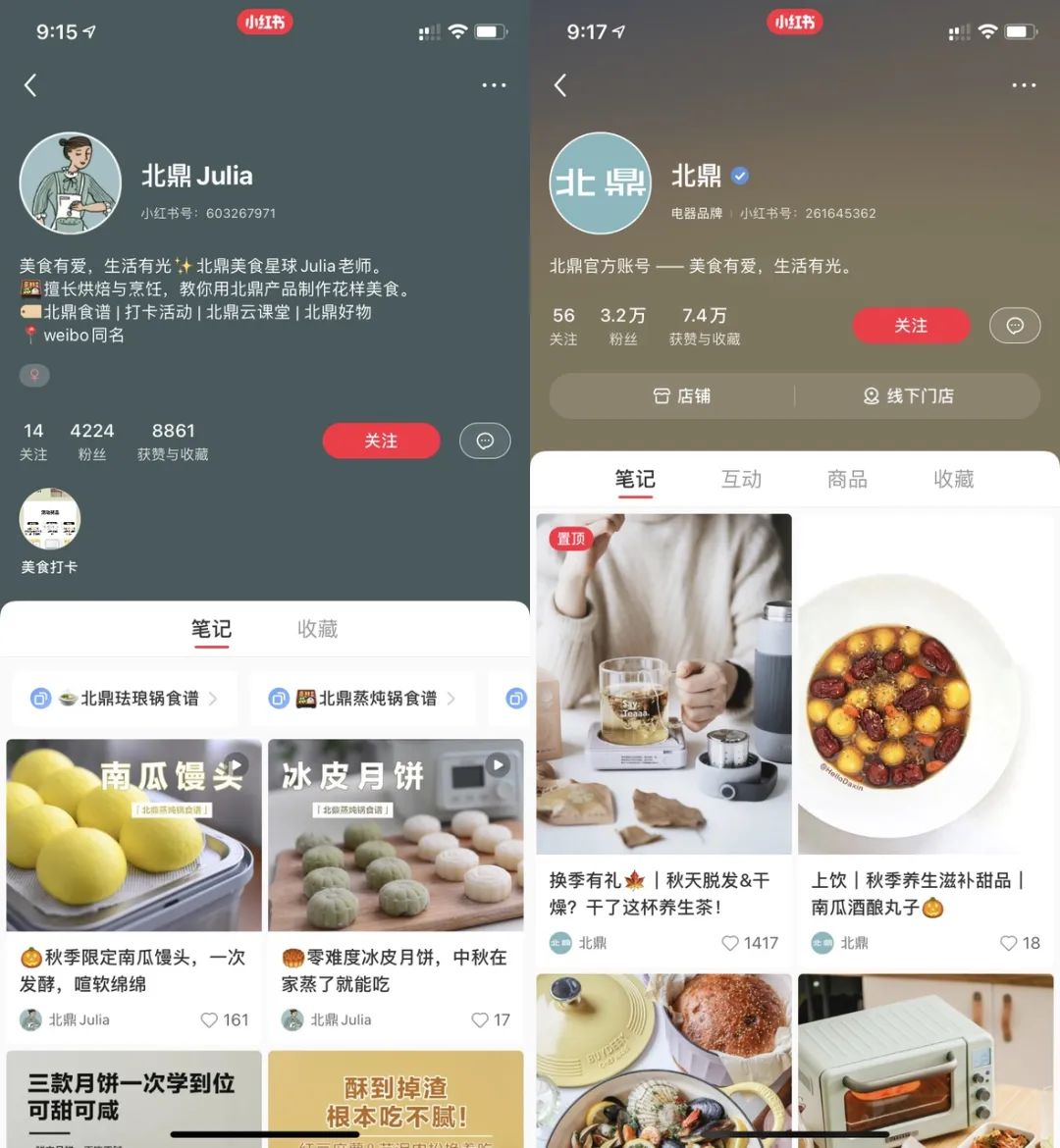 北鼎分官方号分别是小北跟IP号素人美食家Julia;前者主要是图文的形式,发布新品跟一些好看的产品搭配食物的照片;后者是视频的形式,详细的介绍美食如何在他们的产品下被制作出来,补充了官网缺失的产品细节,两者不管是调性还是展现形式都互补了;