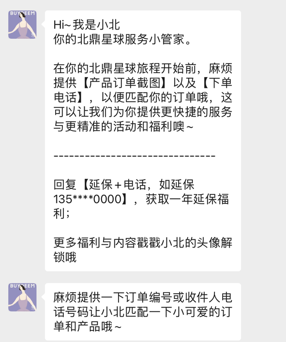 通过购买的包裹卡/短信添加企微后,弹出的话术是针对已购群体的,可以猜测,这是品牌用户分层的第一步。