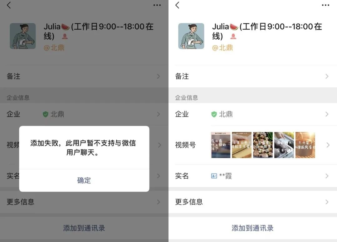 我添加的是小北,Julia是在社群中看到的,无法添加,没有朋友圈,个人信息那里直通视频号。