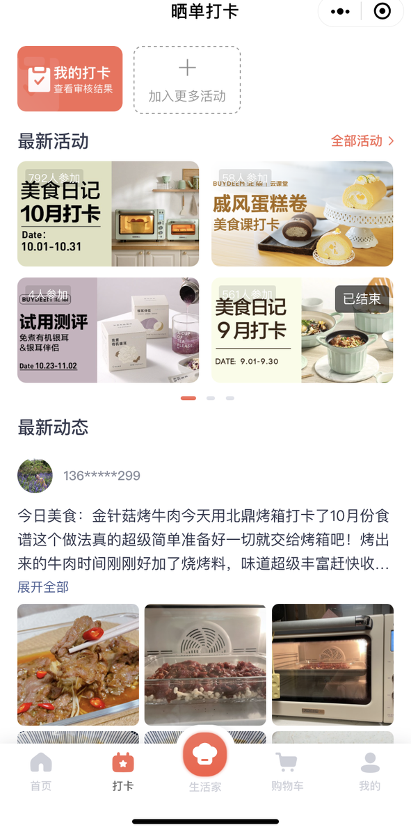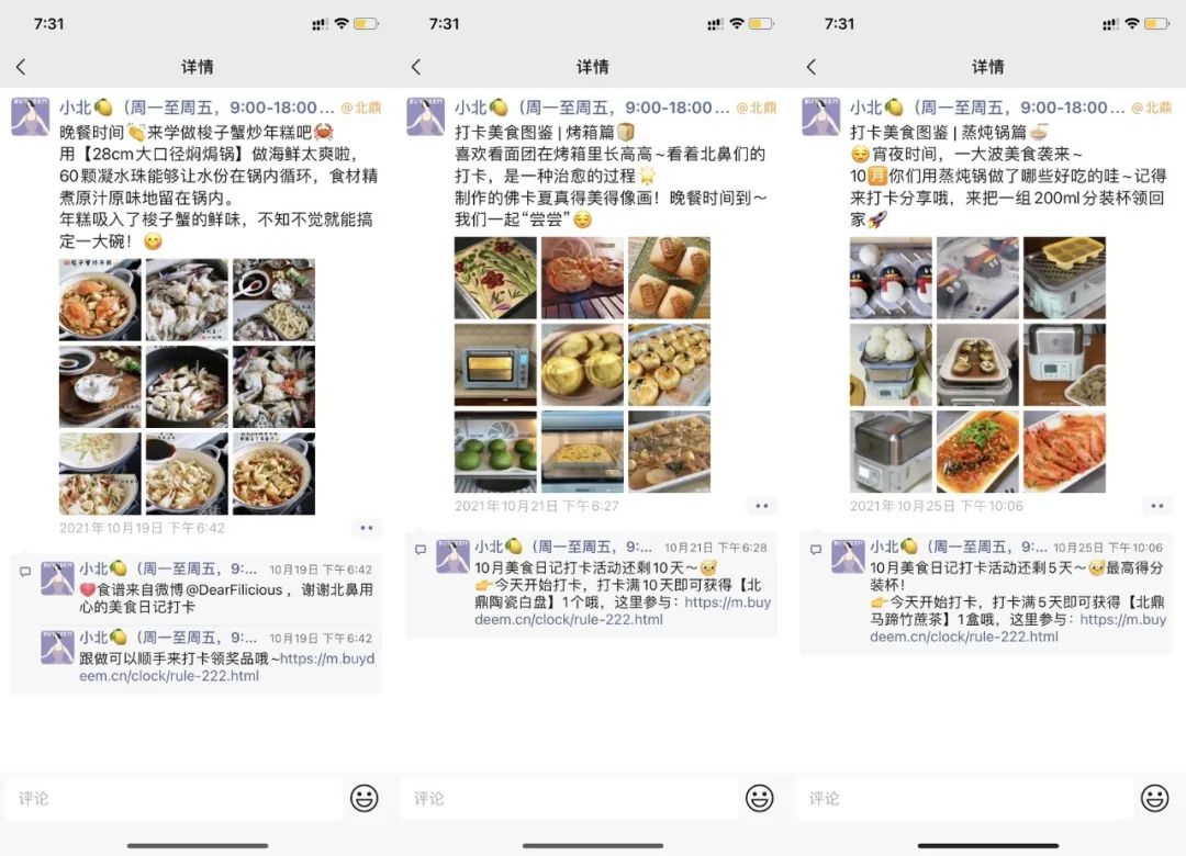 打卡营、拍摄训练营、新品试用都会要求用户在指定的自媒体平台进行作品的发布,在他的小程序内嵌的社区,也都是学员以及北鼎自己的美食制作视频。