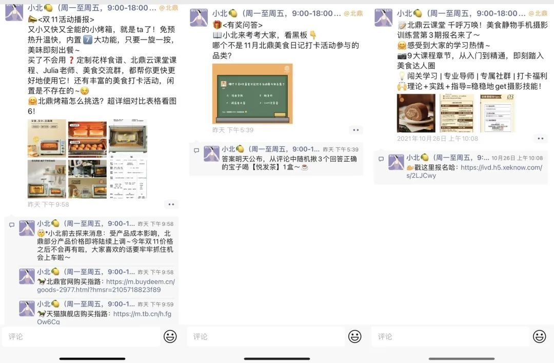 内容:食谱、产品介绍、活动预告/介绍;话术多是反问句式的引起话题。