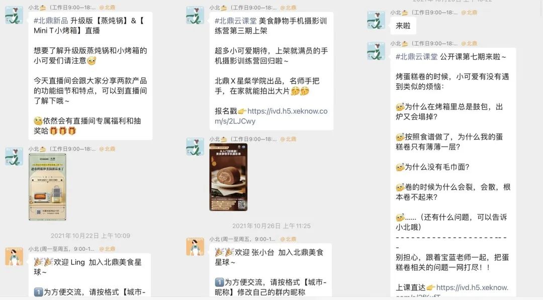 北鼎应该是更加注重打卡群跟拍摄训练营社群的运维,这个美食福利群用来沉淀精准的用户,主要是推送用户会关心的问题来持续的留存用户。