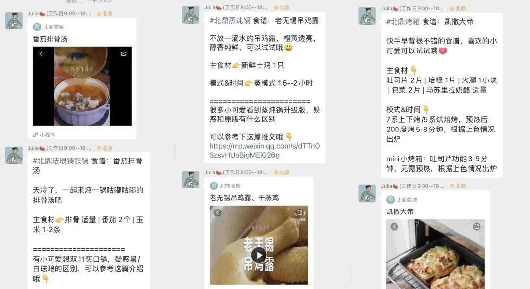 ②北鼎小课堂&北鼎新品:美食搭配厨房器物的内容宣传。以用户会关心的问题作为话术的诱点,吸引用户关注。