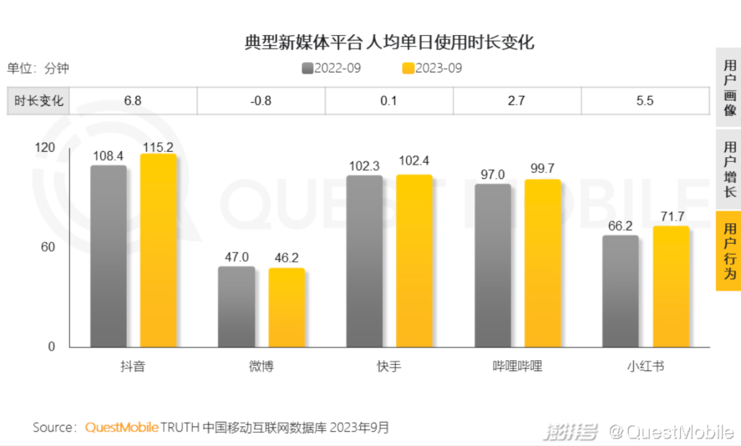 截至2022年Q4,抖音月活跃用户接近11亿,日活跃用户超7.5亿(晚点LatePost报道数据),人均日使用时长达115.2分钟(QuestMobile2023年9月数据,同一报告中的其他平台数据如下,可以和官方公布的数据进行对比及测算)。