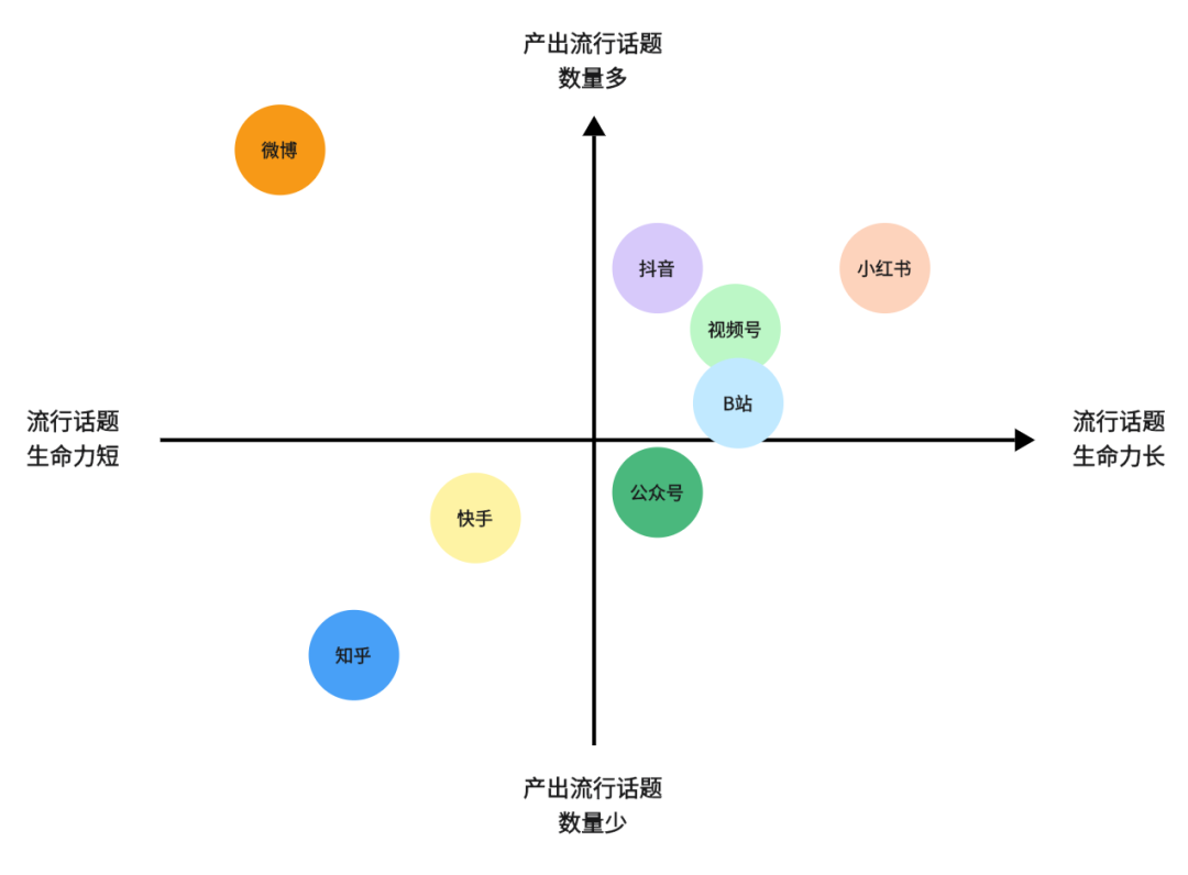 当我们将这套逻辑(产出流行话题数量、流行话题生命力)应用到这8个平台上,就会得到这样一张矩阵图: