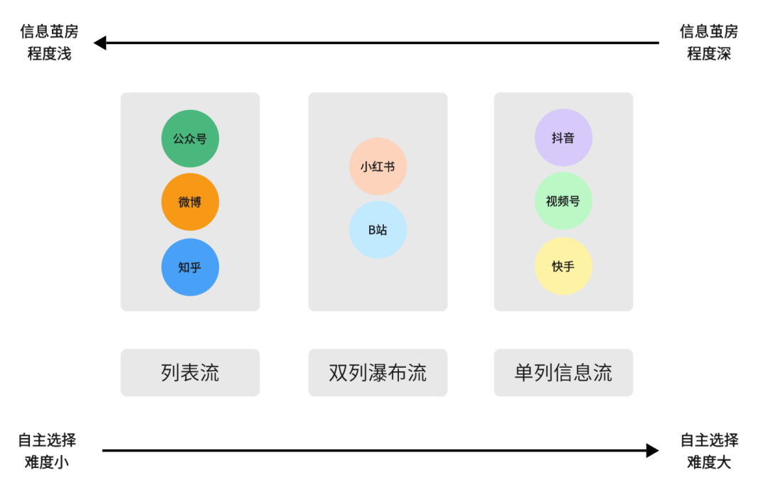 不难发现,从用户“选择难度”或者说“探索难度”的角度看,从易到难的顺序依次是:列表流<双列瀑布流<单列信息流。对应到平台上就是:公众号/知乎/微博<b站/小红书<抖音/快手/视频号。