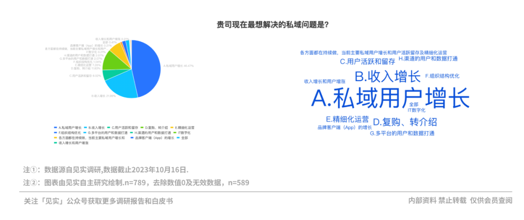 从数据的首几行来看,备受大家关注的问题为“私域用户增长”和“收入增长”两大块,其中,“私域用户增长”被最多企业视为主要问题约占46.47%,“私域收入”占比 21.99%,二者加总起来占比超过68%,这反映出在私域营销中,成交和增加用户数量依旧是核心挑战,企业追求市场扩张和用户基础开始加强。