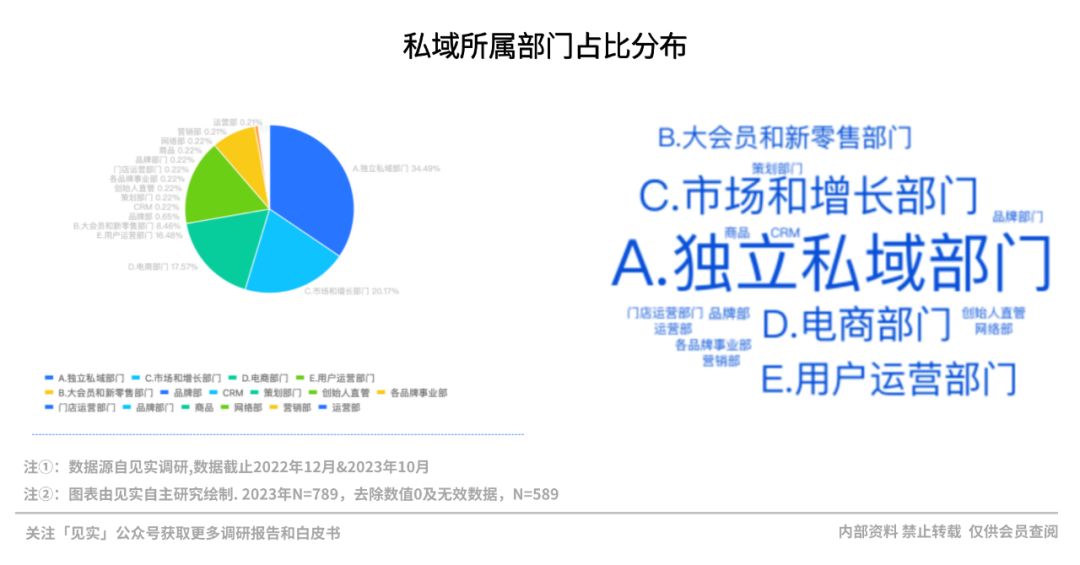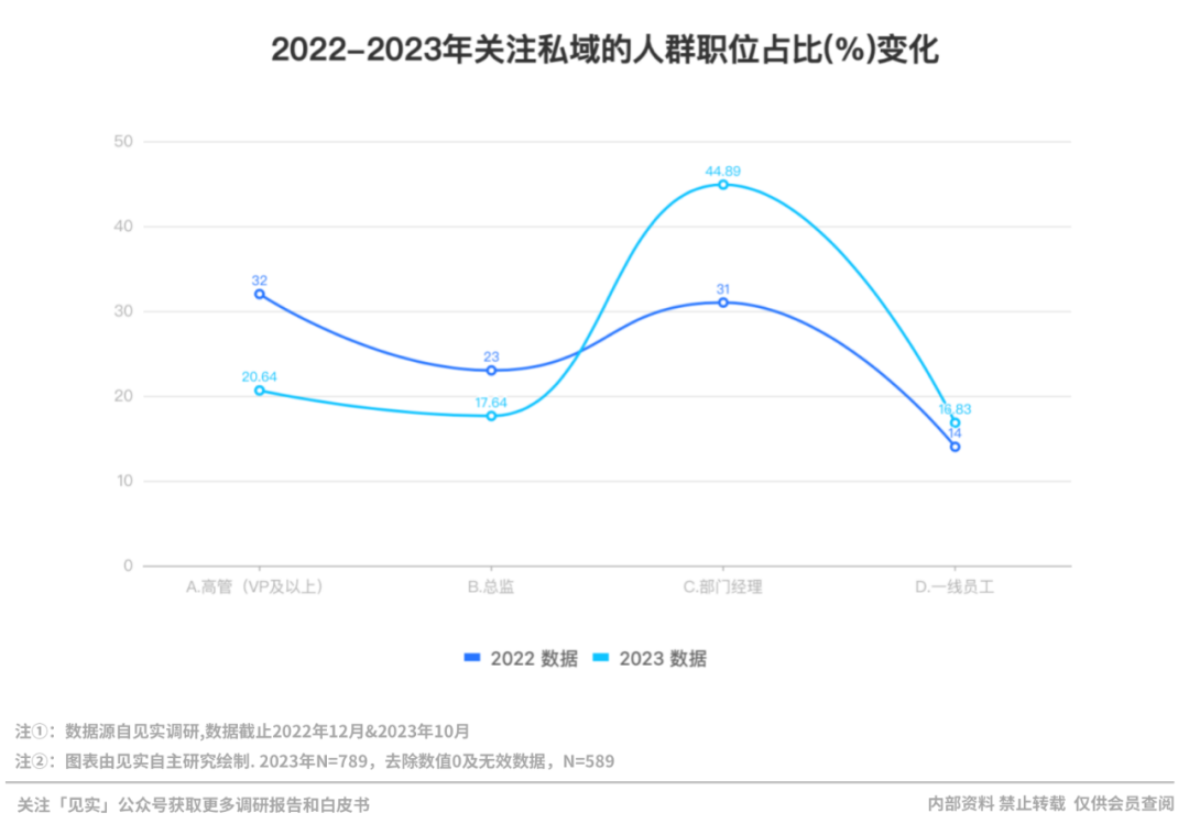 从职级的变化中我们不难发现,私域正在加速组织渗透,即从负责战略规划和跨部门协调的“战略部门”向负责具体业务执行和团队管理的“执行部门”渗透。