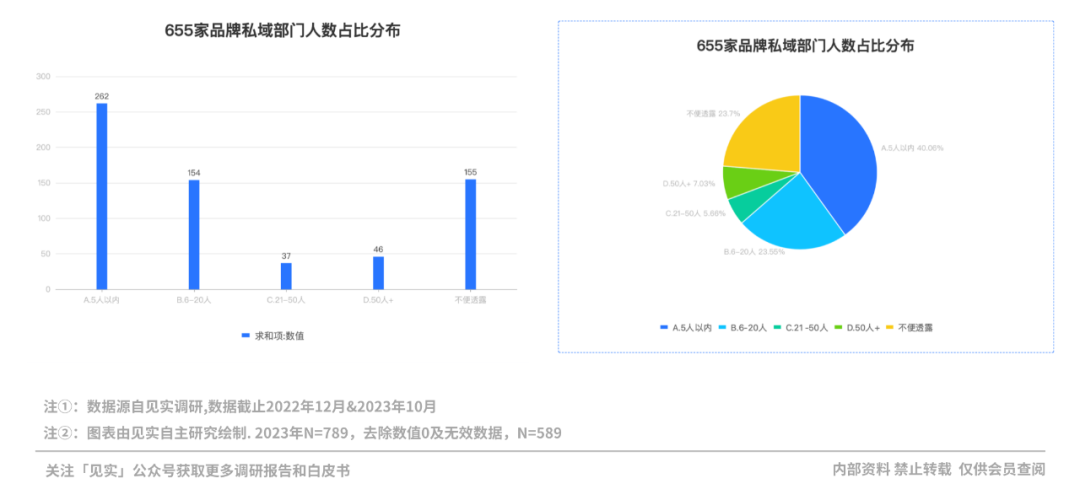 在被统计的 655家品牌中,私域部门人数分布与洞察结论如下:有262 家企业,约占40.06%的企业偏好维持一个“5 人以内”的小型私域部门,这可能是出于成本、灵活性和私域营销策略的考虑;“6-20人”的私域部门数量紧随其后,有154家企业,约占23.55%,这一数据也表明仍然有一定比例的企业愿意对私域营销投入更多的人力资源。