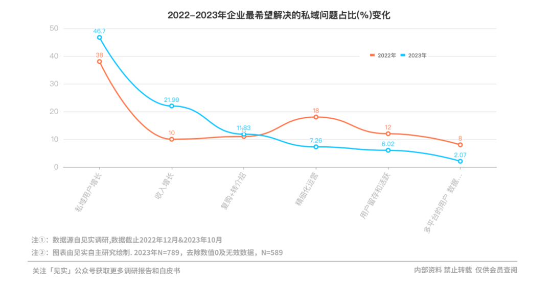 2023年企业最希望解决的私域问题占比中,“私域用户增长”提升了近9个百分点(从38%提升到 46.7%)、“收入增长”的需求提升了近12个百分点(从 10%提升到21.99%)、“复购及转介绍”项也有略微增长,从 11%提升到 11.83%。