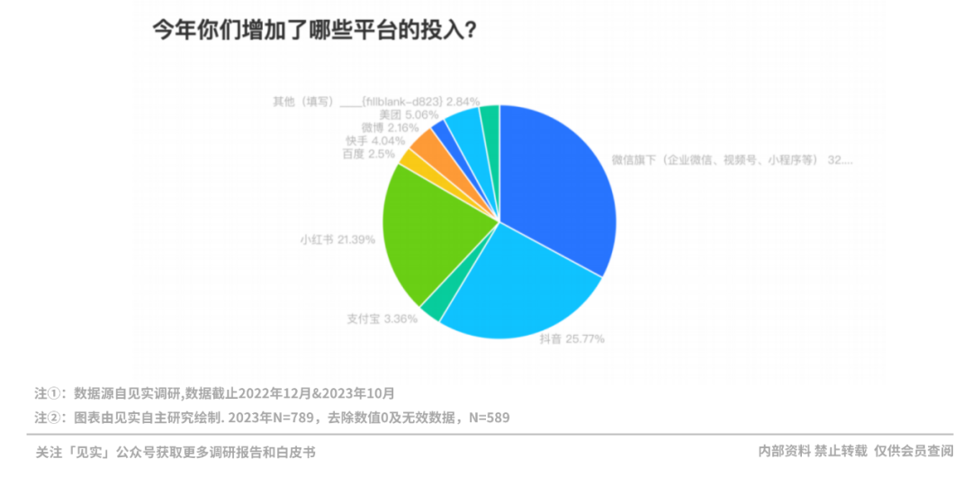 其次,三成企业增加了微信平台的投入,抖音小红书紧随其后。