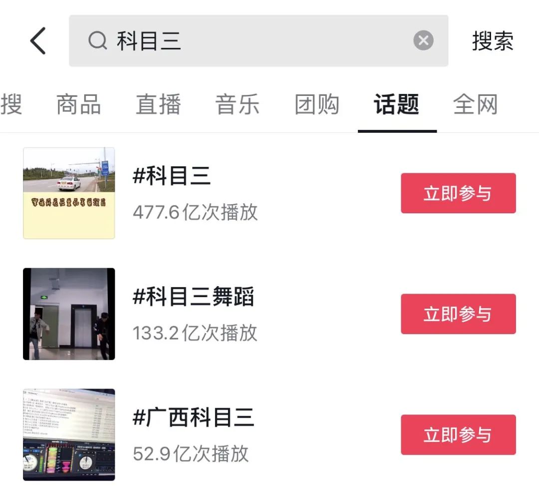 在抖音短视频平台上,与「科目三」相关的话题#科目三 、#科目三舞蹈、#广西科目三的相关视频累计播放量已经超过了663.7亿次。