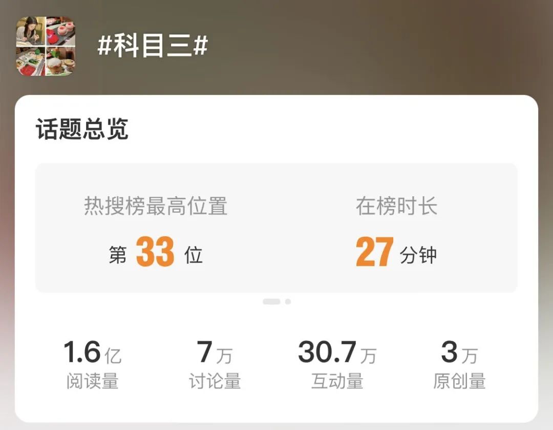 据统计,在微博上,「科目三」单个话题的相关阅读累计达到了1.6亿,互动量为30.7万,产生了3万+篇原创内容。