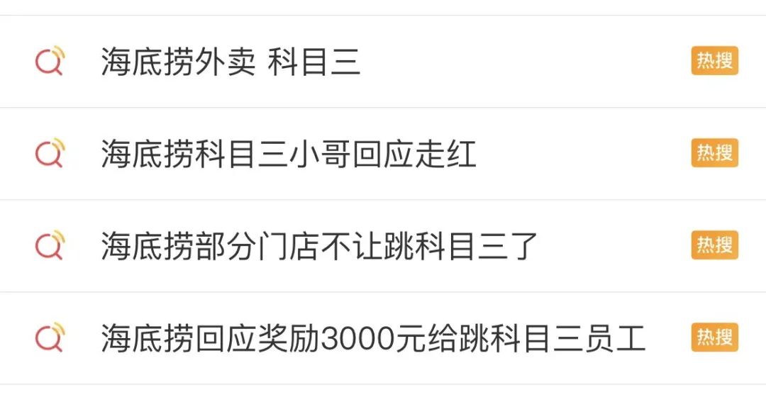 海底捞也因此多次登上了热搜榜,帮助品牌建立了#海底捞外卖 科目三#、#海底捞科目三#、#海底捞回应奖励3000元给跳科目三员工#等多个相关热搜,品牌带来了超高的话题讨论与流量。