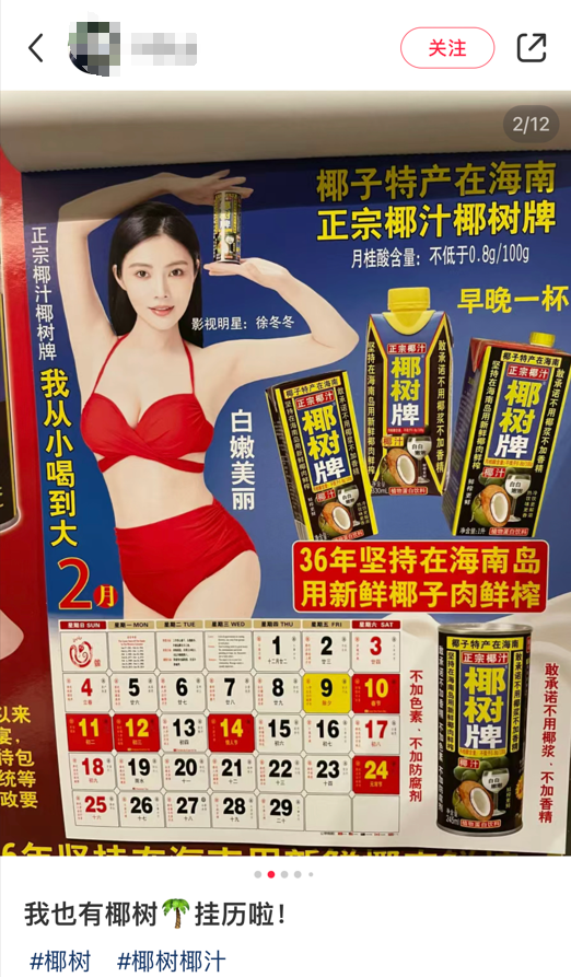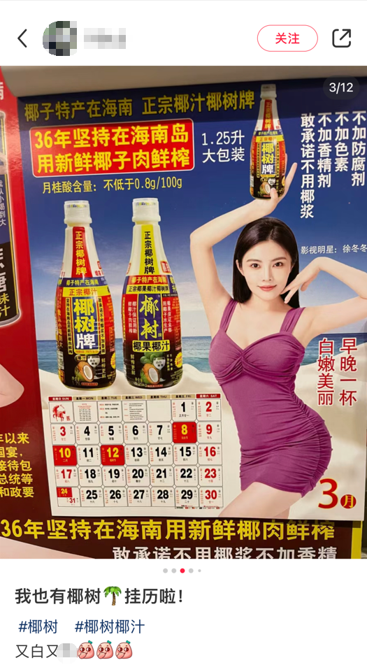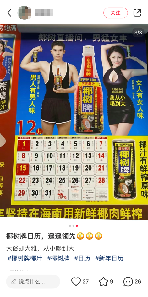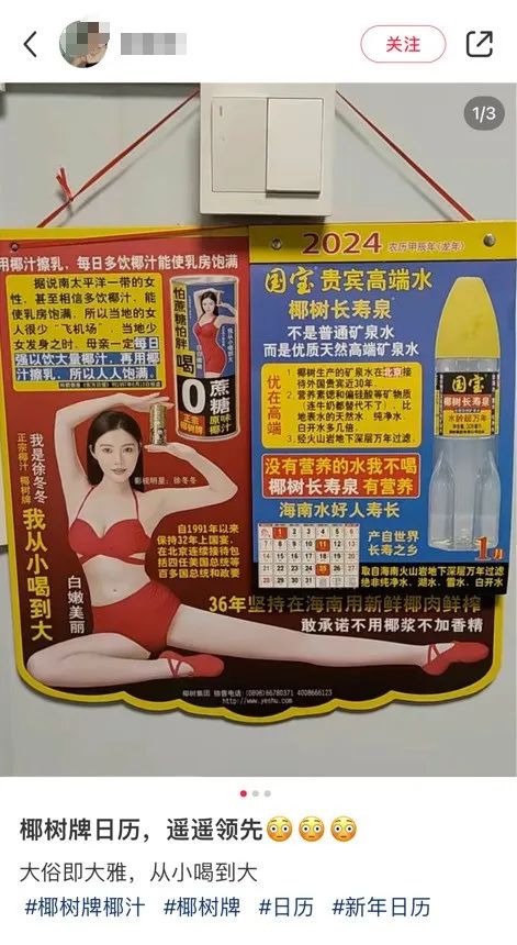 最近,有人在小红书上又晒出了椰树椰汁的龙年挂历,依然是污力满满的擦边球内容,娇美的面容,魔鬼的身材,还有充满想象力的画面……将椰树椰汁的新挂历推上了热搜榜。