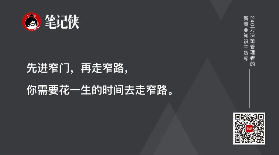 西汉刘向所写的《说苑·谈丛》里有一句话:“君子之治也,始于不足见,终于不可及。”《圣经新约·马太福音》第七章里也说:“你们一定要进窄门。”但是进窄门不是指先走窄路,再进窄门,而是指先进窄门,再走窄路,你需要花一生的时间去走窄路。