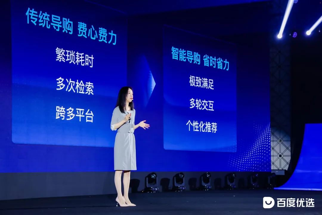 在消费端,百度优选推出了国内首个生成式AI导购——智能导购。大部分人在线下享受过导购服务,线下导购可以帮消费者介绍产品、对比参数、做产品推荐,但在电商领域导购的角色很大程度上是缺失的。电商客服和主播可以承担导购的部分职能,但很难为用户提供全面、周全的服务。