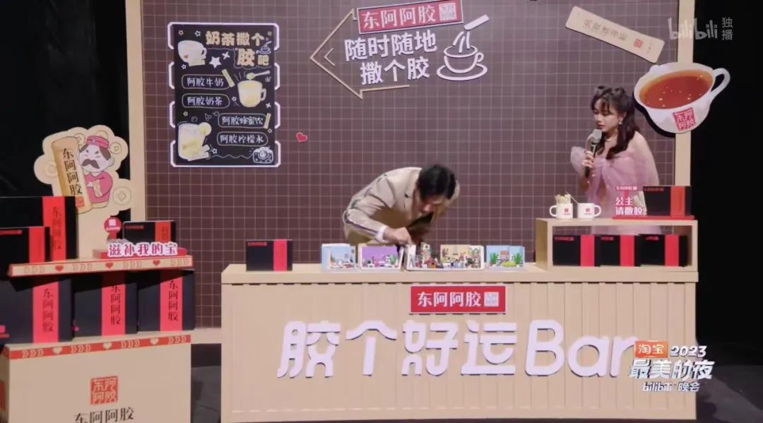 东阿阿胶跟 B 站跨年晚会连续合作了 2 年。第一年,是结合旗下阿胶零食品牌桃花姬,与李玉刚、刘瑾睿演唱的《若把你·声声慢》结合,走国风路子。在 B 站跨晚及一系列品牌动作后,此前连续 8 年没有增长的桃花姬,2023 年 1 月生意将近翻番,整个 2023 年增长超过 60% 。