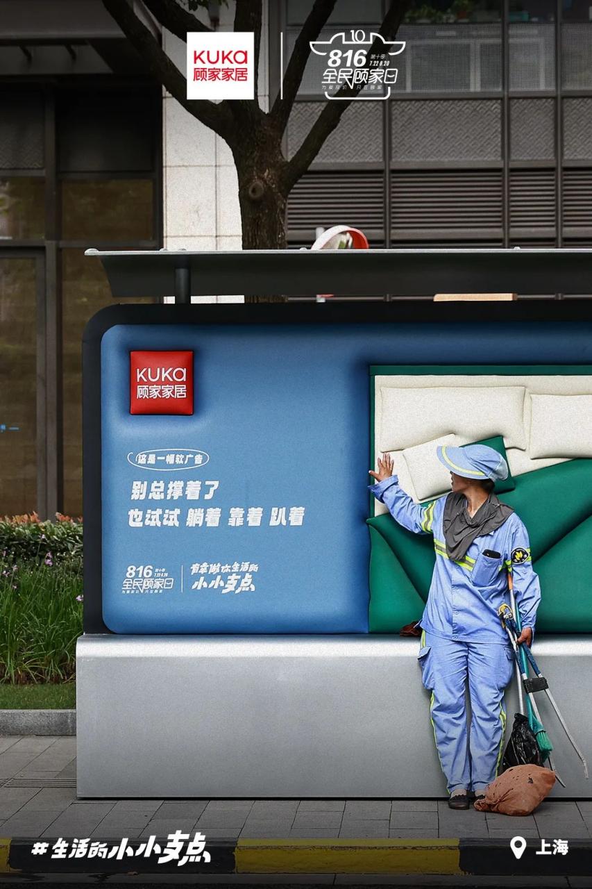 在杭州地铁凤起路站,顾家家居把床搬进了地铁站,每个路过的打工人都有机会沉浸式体验在地铁站「靠一会儿」的快乐。将这些可摸可靠的“软广告”搬到打工人日常奔走的歇脚点,及时地送上柔软支撑。不仅将产品和户外场景巧妙结合,恰到好处的宣传了产品的舒适柔软的属性,还通过这种互动性极强的户外广告更加直接的和用户对话,增强了品牌曝光。