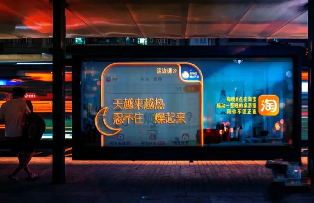 在淘宝正式上线「夜淘宝」功能之际,在户外灯箱广告上,结合 UV 双喷的特殊工艺,用背后打灯来制造白天和晚上的反差,通过视觉和语义的双重变化,揭开夜生活的精彩时刻。