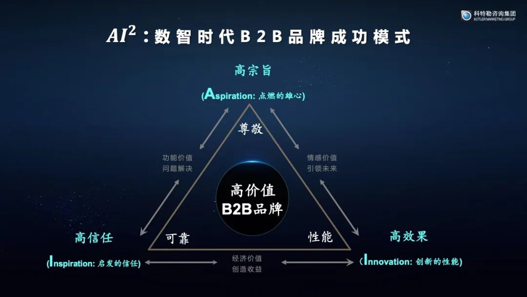 我将为大家带来科特勒咨询集团在全球采用的最新B2B品牌模型,AI2,我们将其总结为金三角模式,称为AI的平方(AI2)。