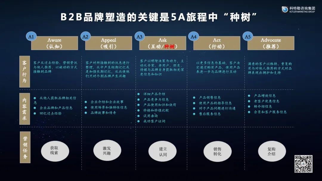 因此A5人群的运营非常重要。在B2B品牌塑造的5A环节中A3种树、A5拥护,两者互相推动和加强形成小闭环,这是打造B2B品牌企业需要非常重视的环境。