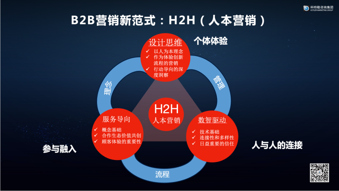 因此我们强调以设计思维为核心,强调个体体验,以服务导向为核心,将产品和服务融入顾客的生意和问题解决中,以数字驱动为核心,连接人与人、企业,这共同构成了H2H人本营销的核心。