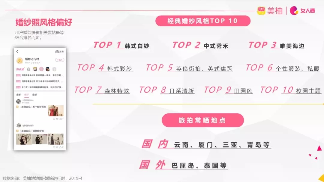 作为纯女性综合服务平台,美柚服务于超2亿女性用户。这些女性用户会在她她圈分享自己的婚嫁照,经过对她她圈-婚嫁进行时圈子中婚纱照帖子分析,她们对于韩式白纱及中式秀禾最为喜爱。