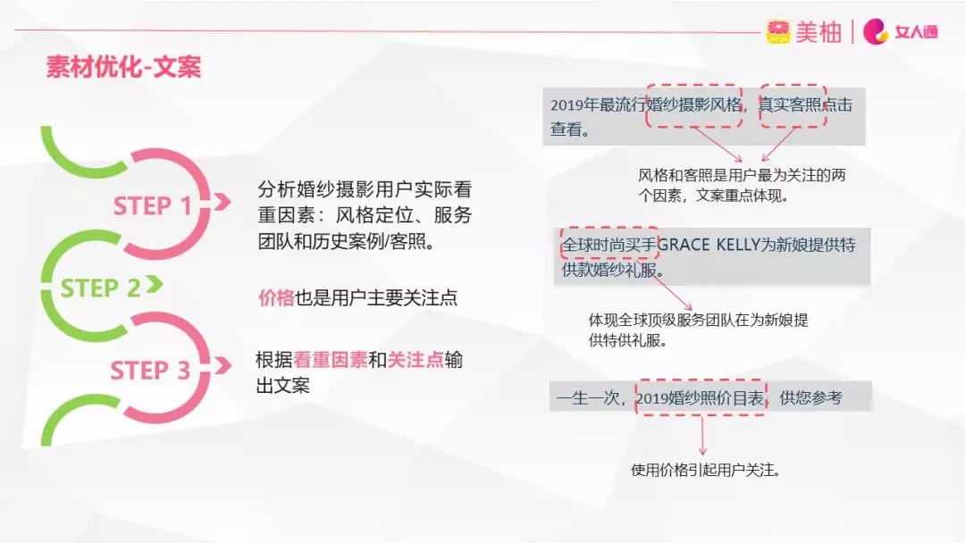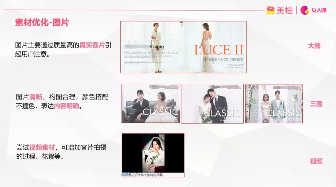 2、 素材优化素材是用户进入广告的入口,女人通素材样式多样,包括大图、单图、组图及视频等。创意方面,抓住用户本质需求是第一诉求: