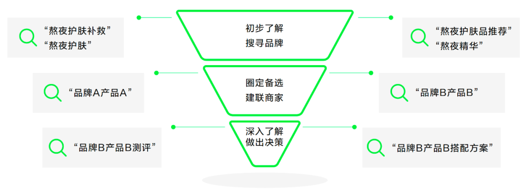 过去搜索营销是漏斗式的,它的目的性很明确,通过层层筛选匹配,最终找到品牌需要的人群进行转化。